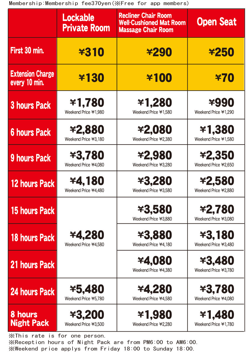 We offer the lowest prices in the area! Starting at ¥250 for 30 minutes.